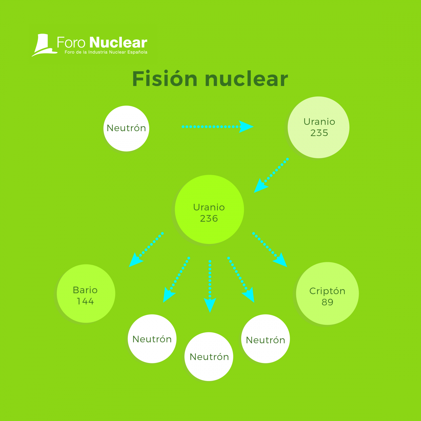 Estos neutrones, a su vez, pueden ocasionar más fisiones al interaccionar con otros núcleos fisionables que emitirán nuevos neutrones, y así sucesivamente. Este efecto multiplicador se conoce con el nombre de reacción en cadena. En una pequeña fracción de tiempo, los núcleos fisionados liberan una energía un millón de veces mayor que la obtenida, por ejemplo, en la reacción de combustión de un combustible fósil.