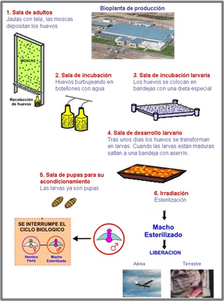 Esta técnica, utilizada desde mediados del siglo XX, consiste en la producción de grandes cantidades de insectos en plantas de cría, que son esterilizados sexualmente con radiación gamma (60Co o 137Cs) para posteriormente ser liberados en la zona afectada por la plaga. Cuando los insectos estériles se acoplan con los insectos silvestres no se producen crías.