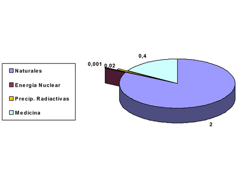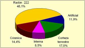 El 88 % de la dosis recibida de radiación por un individuo promedio, procede de fuentes naturales tal como se observa en el gráfico. Como ves, sólo el 11,9 % es de origen artificial, el resto lo recibimos de la naturaleza.