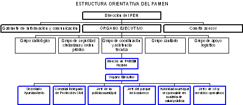 El director del PAMEN podrá contar con un órgano ejecutivo, que tiene como misión prestar asesoramiento y auxilio al Director del PAMEN en todo lo relacionado con el mismo, y que estará formado por el concejal delegado de protección civil, el secretario del ayuntamiento, el jefe de la policía municipal, el jefe del parque de bomberos y la autoridad municipal responsable en materia de salud pública, si existieran, así como por los jefes de otros servicios operativos de la organización de respuesta municipal que sean necesarios. El personal adscrito al PAMEN será previamente designado y acreditado por su director. Responsabilidades del director del PAMEN: